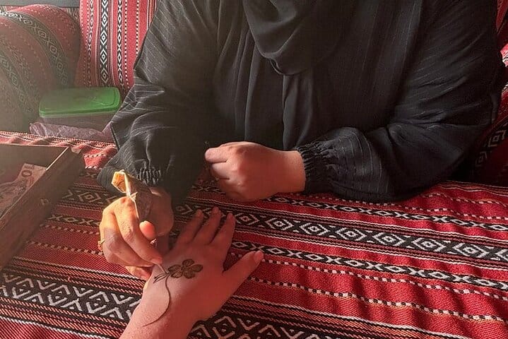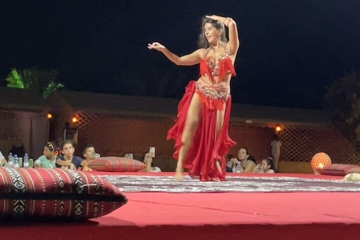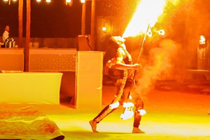 There’s more waiting back at camp: relax with shisha, get a henna tattoo, or try on traditional attire. Then comes dinner — a BBQ feast under the stars, featuring plenty of Arabic flavors and vegetarian options. As night falls, the desert comes alive with energy: a fire show, belly dancing, Tanoura spinning dance, and more.