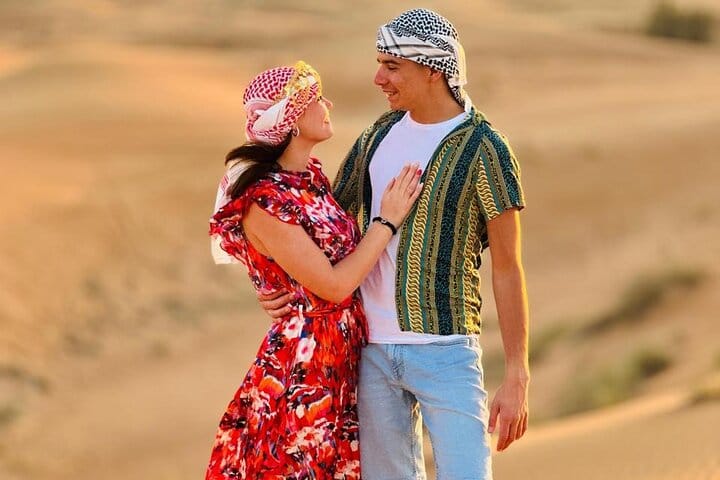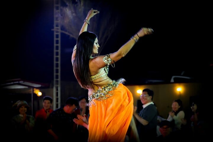 Back at the desert camp take time to relax with shisha, enjoy a henna tattoo or try on traditional attire. As evening sets in enjoy a delicious BBQ dinner under the stars featuring authentic Arabic flavors along with vegetarian options. Enjoy lively entertainment including a fire show, belly dancing ,and the traditional Tanoura dance.