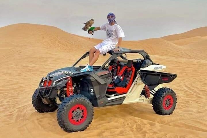 Once you hit the dunes, your licensed guide takes you on a rollercoaster ride through the golden sands — with dune bashing, sunset photo stops, free sandboarding, and unlimited camel rides. Get up close with a majestic falcon, and choose optional extras like a quad bike or dune buggy for even more thrill (available at an additional cost).